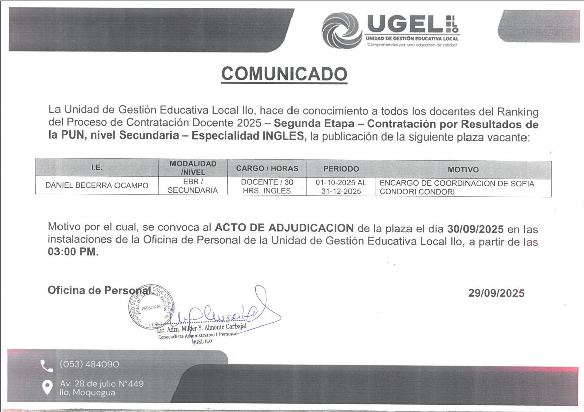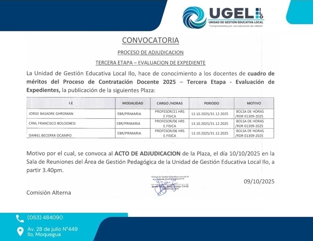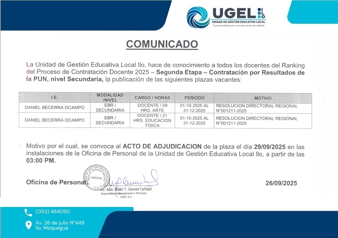 Ugel Ilo reconocera a Docentes por 25 y 30 años de servicio